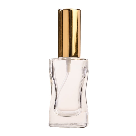 30ml Clear Glass Square Curved Perfume Bottle with Gold Spray & Gold Cap (18/410)